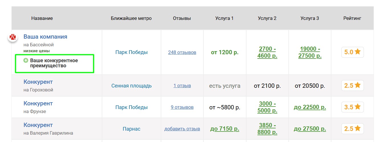 Если компания имеет конкурентные преимущества, мы можем их опубликовать на странице центра и показывать в таблицах в соответствующих страницах. Преимущества можно гибко настраивать для разных услуг. Правильная публикация преимуществ существенно увеличивает интерес клиентов, так как выделяет центр в таблицах и показывает, почему следует обратиться именно туда.