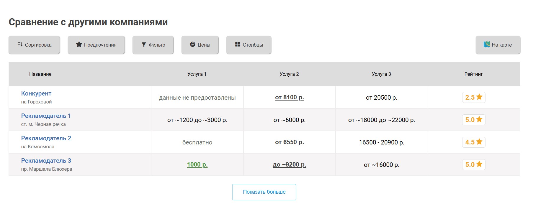 Вокруг продвигаемого таким образом центра выбирается некоторое количество ближайших конкурирующих центров, продвигаемый центр попадёт к ним в таблицу «Сравнение по ценам», которая выглядит следующим образом: